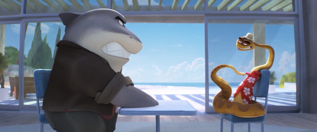 (from left) Shark (Craig Robinson) and Snake (Marc Maron) in DreamWorks Animation’s The Bad Guys, directed by Pierre Perifel.