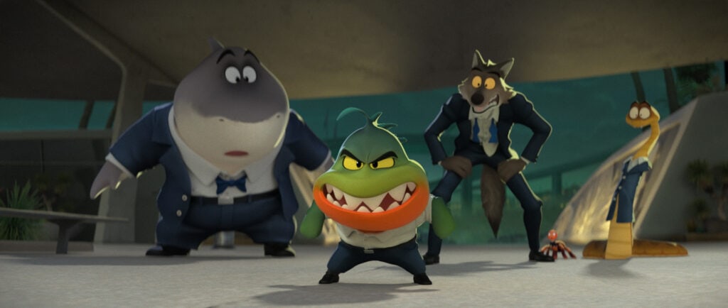 (from left) Piranha (Anthony Ramos), Snake (Marc Maron) and Shark (Craig Robinson) in DreamWorks Animation’s The Bad Guys, directed by Pierre Perifel.